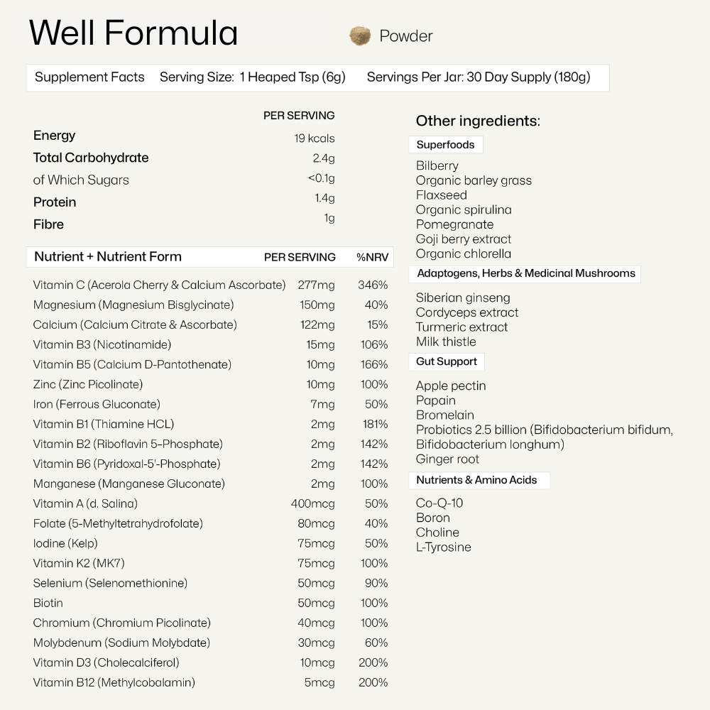 Well Formula has been carefully formulated to boost energy and general well-being by helping to support all vital body systems including hormones, detox, brain health, metabolism and the gut.